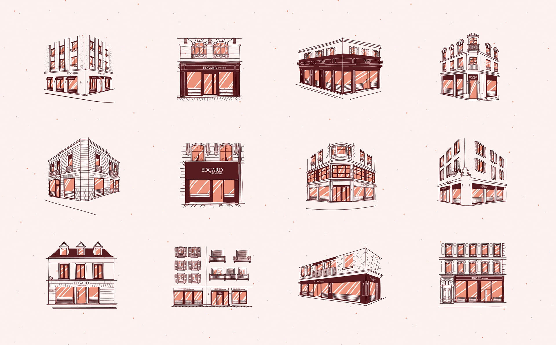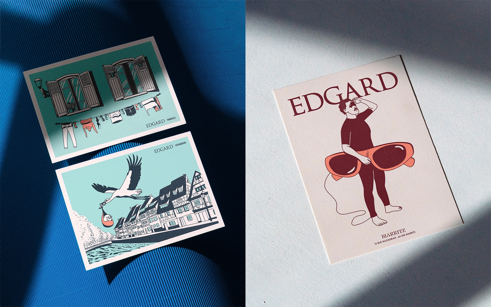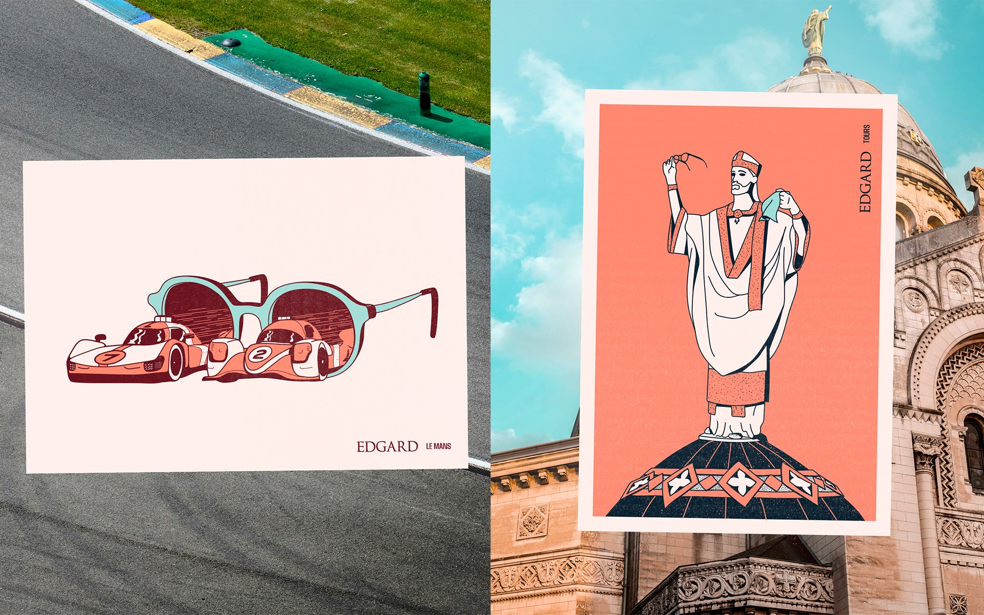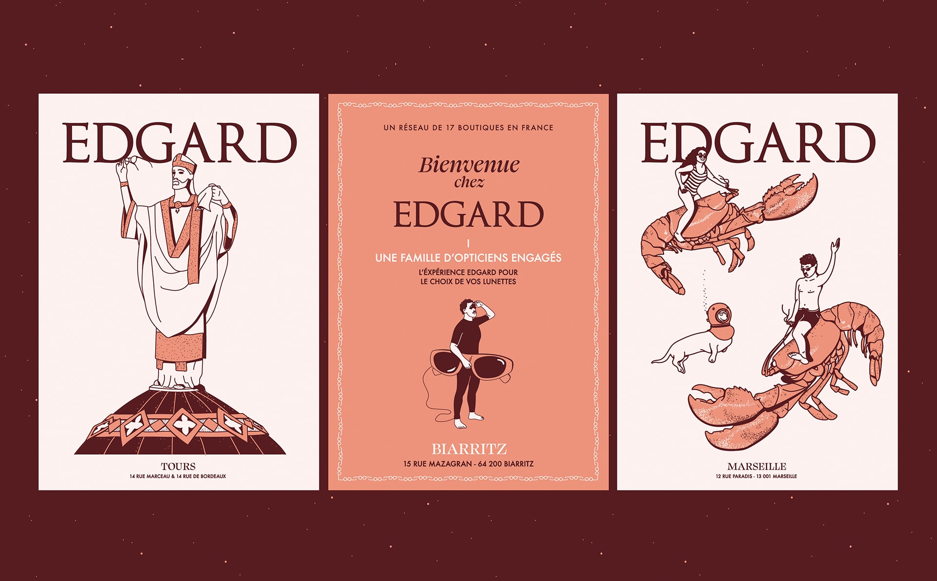 Edgard est une famille d’opticiens engagés et passionnés qui ne cesse de s’agrandir depuis sa création en 2001 à Tours. Aujourd’hui, tous les chemins mènent chez Edgard, que l’on retrouve dans une dizaine de villes françaises. Même si les boutiques ont toutes en commun d’être des lieux chaleureux et humains, chacune d’entre elle est unique car profondément marquée par la culture de sa ville et la proximité avec ses habitants. Être unique, c’est aussi ce qui caractérise les clients d’Edgard dont les montures pleines de caractère révèlent la personnalité de chacun. Cette série d’illustrations mettant en scène les villes du réseau Edgard ont été réalisées dans le cadre du rafraichissement de l’identité visuelle du groupe.